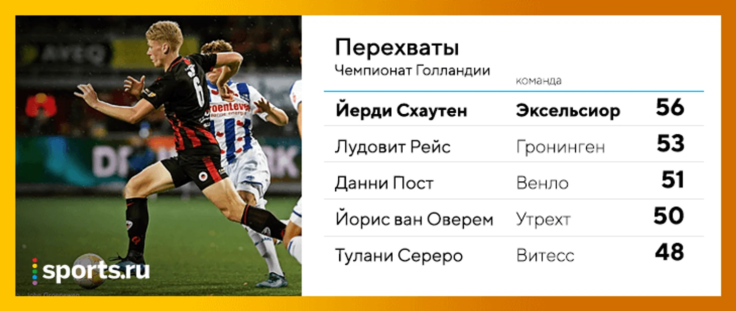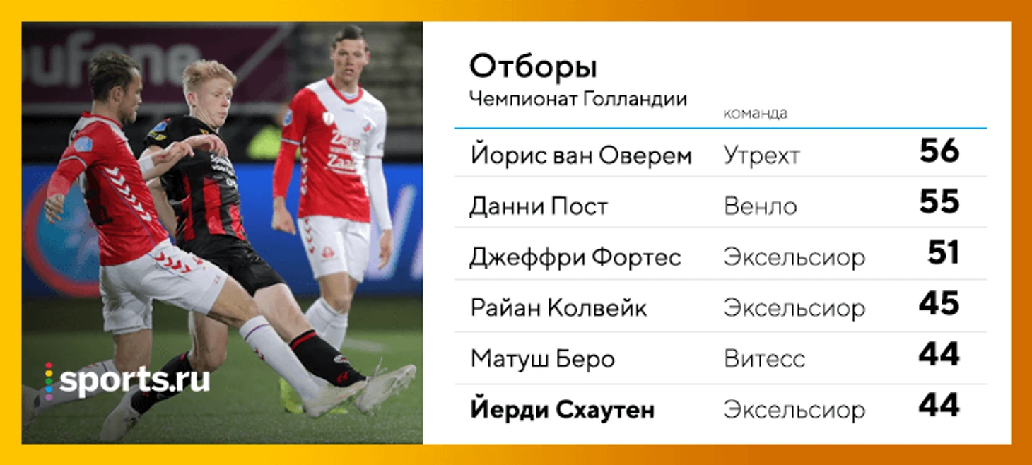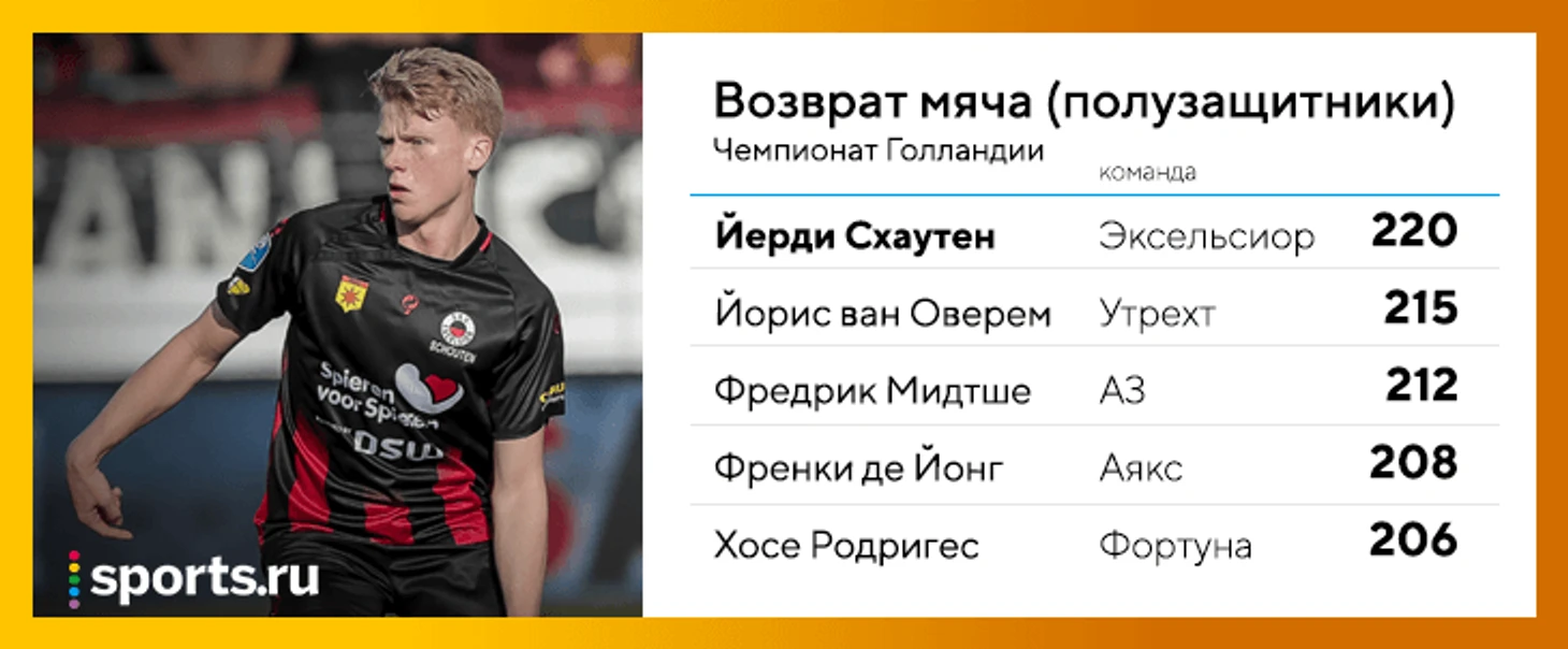Нетрудно заметить, что Йерди Схаутен входит в число лучших опорников чемпионата. По совокупности дисциплин, пожалуй, абсолютно лучший. Даже в общем зачете отвоеванных мячей его опережает только защитник «Аякса» Дэйли Блинд (230). Любопытно, что, несмотря на такие чернорабочие функции, Схаутен неплохо владеет мячом – на его счету 33 успешных обводки. Это, конечно, меньше, чем у Френки де Йонга (49). Однако следует учесть, что «Аякс» и мячом владеет гораздо больше, чем «Эксельсиор» (60% против 48%).