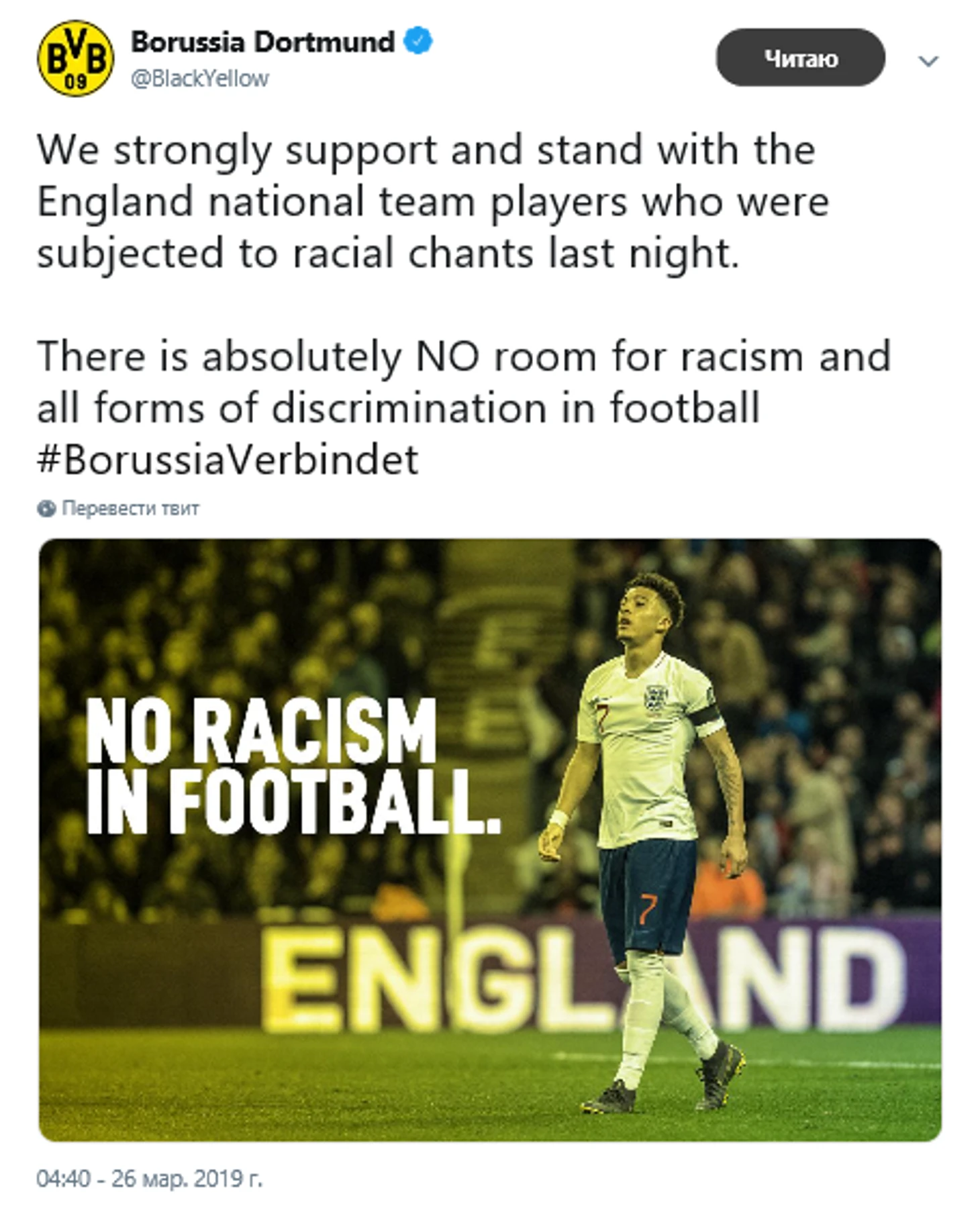 Аккаунт «Боруссии Дортмунд» в Твиттере после матча сборной Англии против Черногории, в котором было много расистских высказываний в сторону Стерлинг, написал о том, что расизму нет места в футболе.