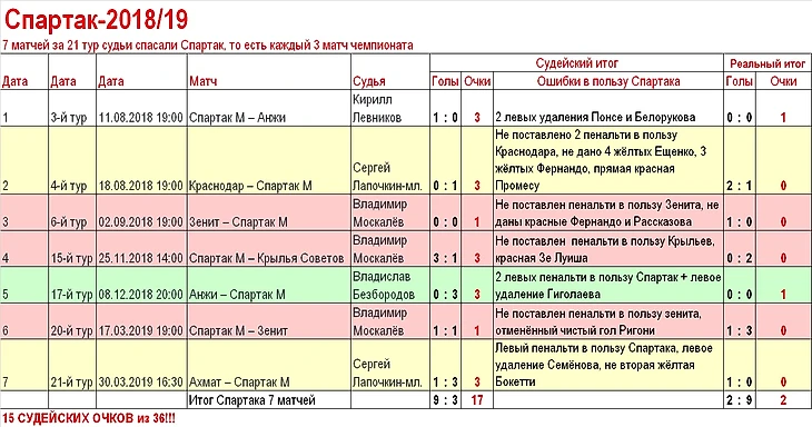 То в пользу Спартака судьи ошибались почти столько же, сколько в пользу всех остальных команд вместе взятых 7 раз!