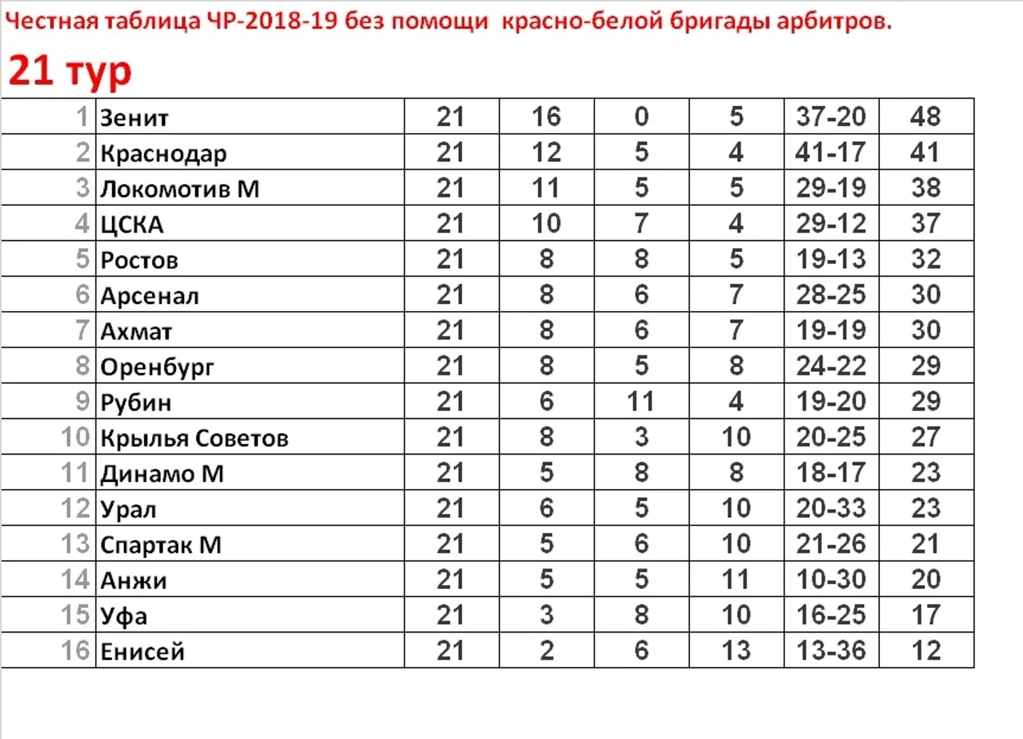 Честная таблица ЧР 2018-19. После 21 тура ЧР