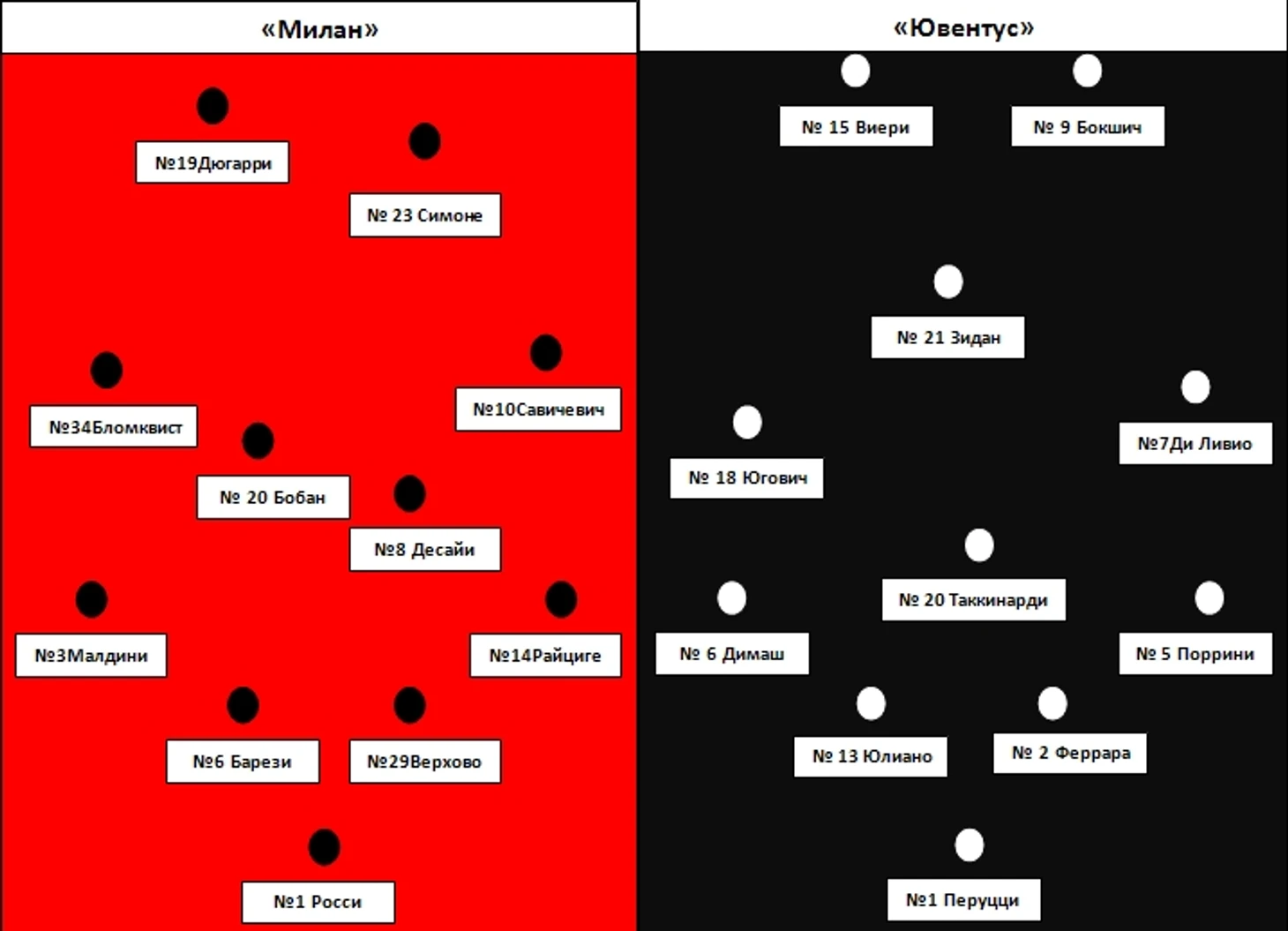 По дублю оформили Владимир Югович и Кристиан Вьери, по одному голу забили Зинедин Зидан и Никола Аморузо. За «Милан» отличился Марко Симоне.