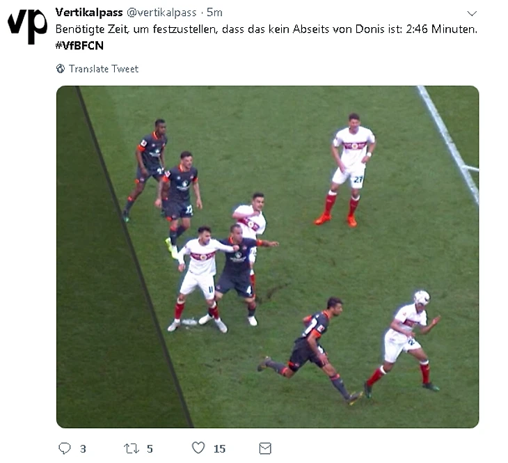 Сумей «Нюрнберг» удержать этот счёт, отставание от 16-го места, которое в текущей ситуации является для клуба единственной надеждой на спасение, сократилось бы до одного очка. И «Штутгарт» подарил «Нюрнбергу» целых полчаса надежды, действуя стратегически осторожно и укрепляя позицию нападения (Гонсалес и Дидави вместо Эссвайна и Бека). Но на 75-й минуте Озан Кабак, девятнадцатилетний защитник сборной Турции, поставил крест на счастливом для «Нюрнберга» исходе, забив свой третий мяч за сезон. Причем надежду гостям пришлось хоронить в два этапа, с трехминутным томительным ожиданием: именно столько потребовалось судье, чтобы выяснить, не забрался ли в офсайд Анастасиос Донис, с чьей голевой передачи мяч оказался в правом нижнем углу ворот. Вердикт — не забрался, — и счёт 1:1 снова породили хаос в игре.