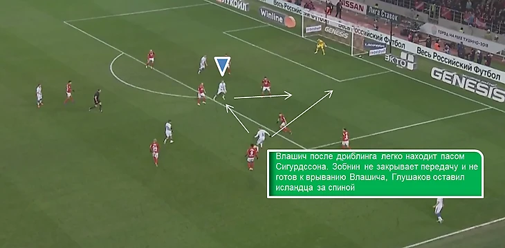Исландец в итоге сделал дубль и больше всех раз касался мяча в штрафной соперника (8), на счету Влашича «ассист» пяткой, больше всех в игре последних передач под удар (4), самое большое число острых передач в штрафную (6), третье место в дерби по количеству касаний мяча в штрафной (5) и второе по числу удачных обводок (5). Такая потрясающая эффективность исландско-хорватского атакующего дуэта армейцев связана с новой ролью Фернандеса и необъяснимо медленной опорной зоной Спартака, которая ни к подобной геометрии атак ЦСКА, ни к их возросшей интенсивности оказалось абсолютно не готовой. В моментах, приведенных ниже, небольшое подтверждение потери концентрации центром поля красно-белых.