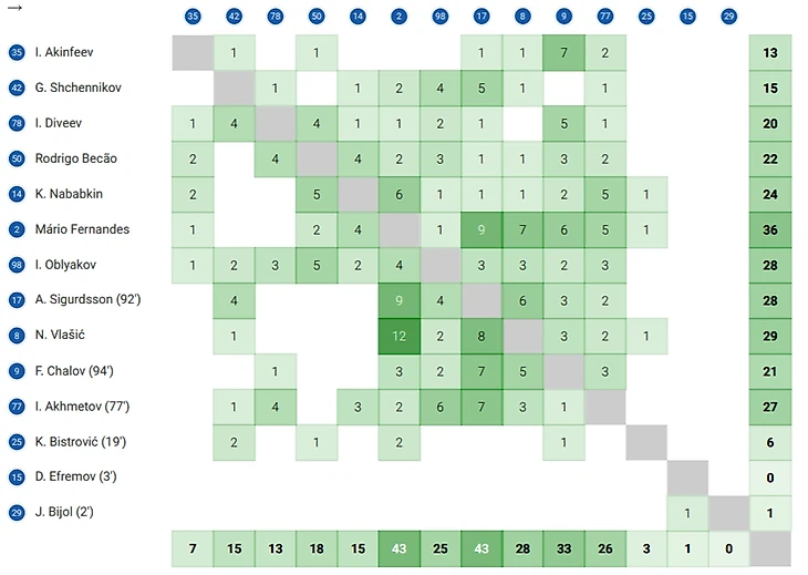 В атаке Фернандес был крайне эффективен, все его показатели игры в нападении в дерби были выше средних по сезону, что лишний раз подтверждает верность задуманной трансформации Марио белорусским специалистом. Русский бразилец сделал больше всех в матче «progressive passes» (продвинул атаку команды передачей на 15 метров вперед, судя по среднему положению на поле), в сверхплотной игре 13 таких точных пасов это очень много при средних 10 в сезоне для Фернандеса. Марио сделал 5 «progressive runs» (забег с мячом вперед на 15 метров) при 2,77 средних по сезону. Остановимся на этих индикаторах не просто так (все остальное уже по 100 раз оговорено, обводки, голевые передачи, выигранные дуэли и прочее, это и так все знают). Такая высокая эффективность Марио при продвижении мяча вперёд позволила Влашичу и Сигурдссону освободиться от участия в построении атаки и регулярно получать мячи в штрафной соперника или около неё, когда, собственно, атаку уже пора завершать. В карте взаимодействия можно увидеть, сколько передач было сделано между Фернандесом, Сигурдссоном и Влашичем (21 передача – половина всех пасов Марио в игре).