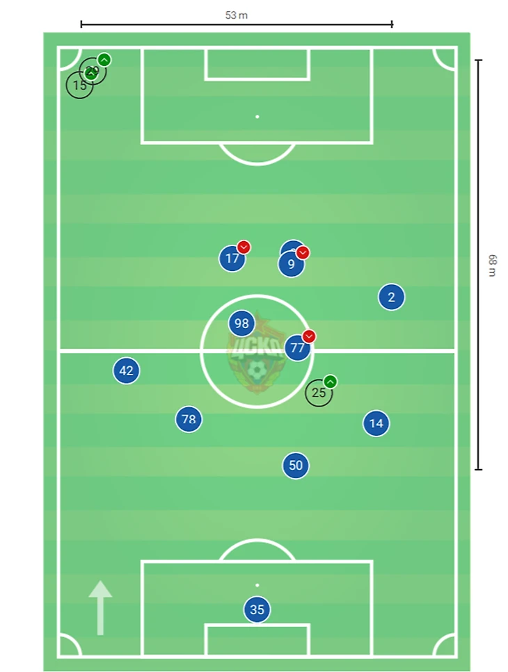 Первый из них, интересный ход от Гончаренко, просматривающийся на протяжении последних матчей, это использование нереальных физических кондиций Марио Фернандеса. При позиционном нападении и контратаке русский бразилец атакует по всему правому флангу от своей штрафной до конца поля, выступая в роли вингера, а при обороне Марио дисциплинировано успевает возвращаться назад либо в опорную зону, либо на позицию глубокого правого защитника, где его всегда страхует Набабкин. Подобный универсализм Фернандеса позволяет армейцам иметь численное преимущество и в атаке, трансформируя схему в «4-2-3-1», и в защите, играя в привычные «5-4-1». Таким образом Гончаренко решает проблему вариативности в атаке при сильно оборонительной схеме, добавляя построению сильный правый крен. На рисунке представлены усредненные позиции игроков ЦСКА на поле, среди которых очевидно просматривается новое место Марио в атаке.