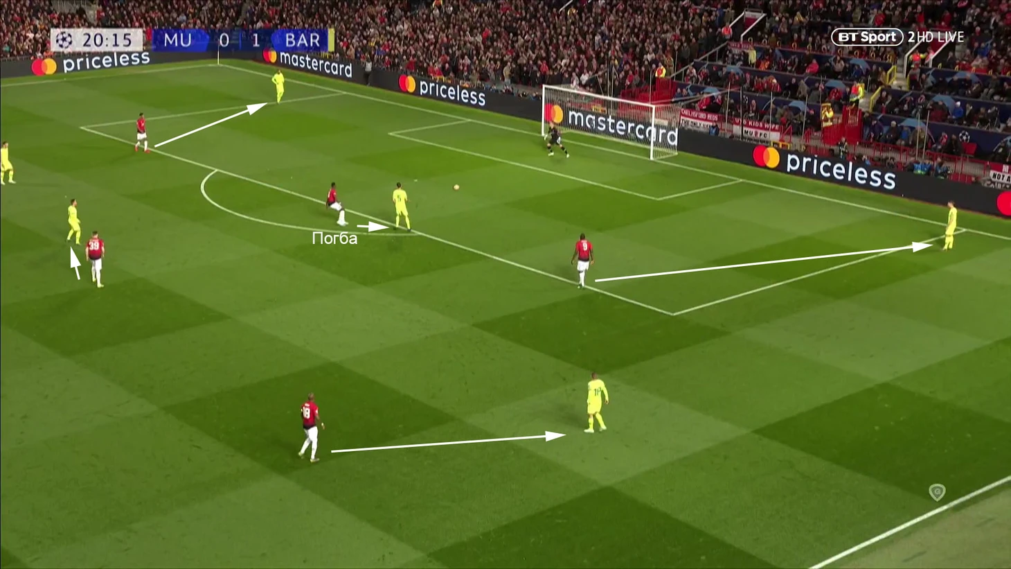 Первый момент – свобода одного из полузащитников (Ивана Ракитича или Артура) после быстрого перемещения мяча с одного края поля на другой. У «МЮ» в центре была лишь тройка против тройки «Барсы» плюс Месси – всех блокировать не успевали. Дальнего полузащитника оставляли свободными и накрывали не сразу: