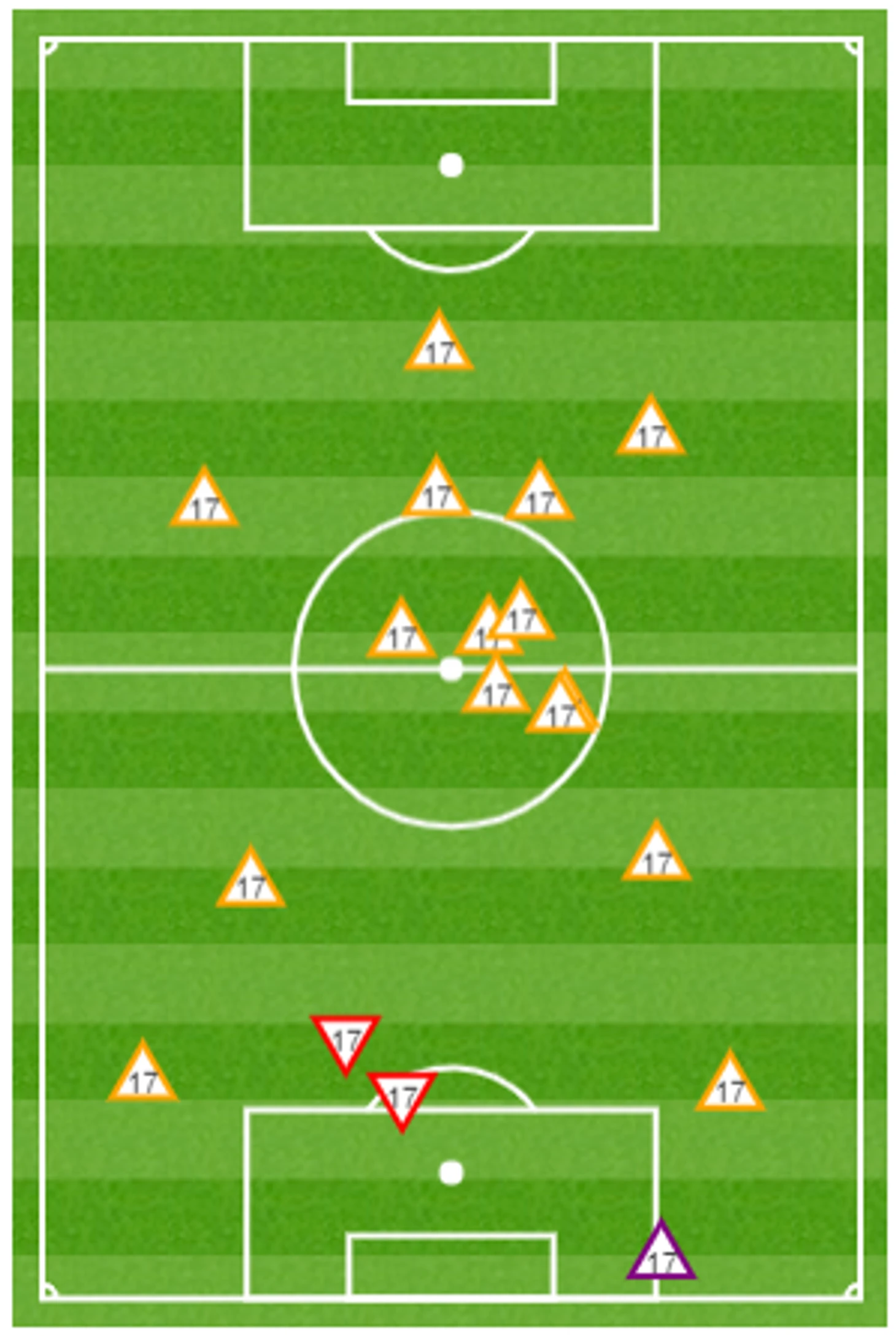 Во-вторых, он сделал 15 подборов – с отрывом лучший результат. Это выдающийся объем защитной работы, без которого прессинг «МЮ» развалился бы. Вот карта его оборонительных действий: