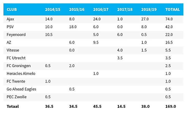 Вклад «Аякса» в общую копилку голландских клубов только в этом сезоне составил 71% (27 из 38). Если брать пятилетку, то – 43%. Что все-равно очень прилично. Доли ПСВ и «Фейеноорда» гораздо скромнее – 25% и 13%, соответственно.