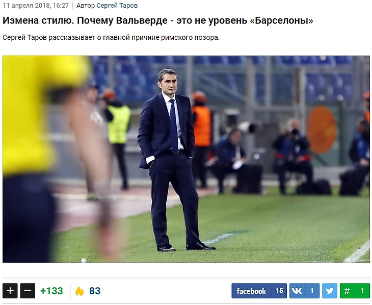 Уже начинает тошнить от такого зрелища. Противно видеть как "Барселона" отказывается от своего фирменного атакующего футбола. Год назад "Рома" уже наказала Вальверде за прагматизм, но он так ничего и не понял. Нынешнее поколение "Барселоны" просто не приучены играть в подобном стиле.