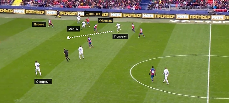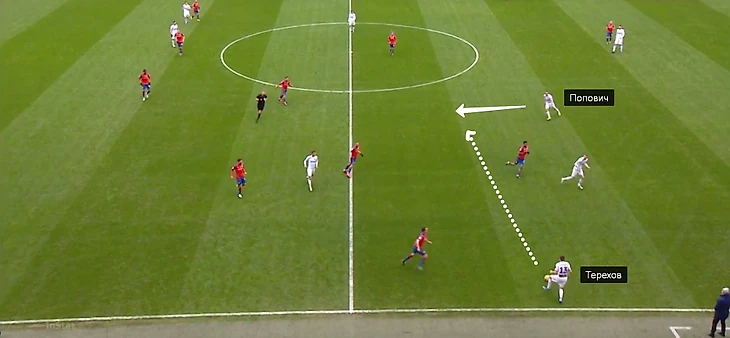 Попович вообще занял позицию опорника (там могли сыграть Афонин или Чиркин): Бреев располагался чуть выше и правее, Мишкич – чуть выше и левее. Словенец впервые в РПЛ играл так низко – и эта идея Федотова была очень дерзкой.