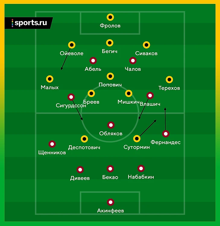 Замены Гончаренко были логичны: Нисимура вместо Абеля и полноценный переход на 4-1-3-1, при которых японец закрывал правый фланг полузащиты, а Влашич и Сигурдссон менялись позициями; более атакующий Ефремов вместо Щенникова; Магнуссон вместо Набабкина и перевод Ефремова направо – исландец мог пригодиться при длинных передачах, аутах и других стандартах.