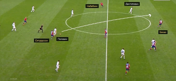 В третьем голе Попович вообще сделал голевую передачу: на этот раз полузащитник «Оренбурга» забрал подбор после верховой борьбы Бреева и Дивеева и выдал внешней передачу на Деспотовича – в левый полуфланг, который оказался свободен из-за высокой позиции Набабкина при атаке ЦСКА. Ассист получился случайным (удар Деспотовича очень сложно повторить), но выбор позиции для подбора и передача в свободную зону – на очень хорошем уровне.