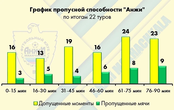 Большинство поломок дагестанского «автобуса», как это обычно и бывает, приходится на концовки матчей. В последние полчаса частота возникновения голевых ситуация у ворот Дюпина увеличивается примерно в полтора раза, а пропускная способность – почти вдвое (17 из 35 голов после 61-й минуты).