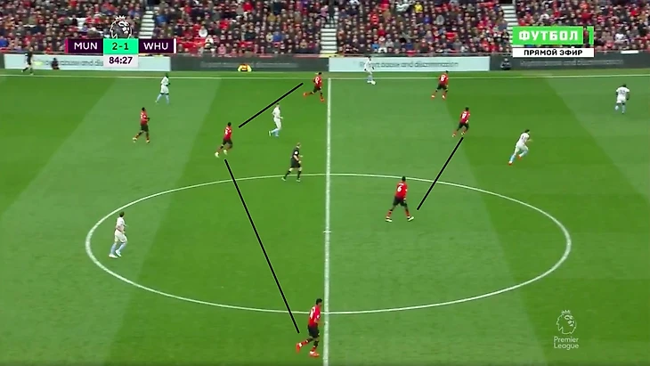 На 75 Сульшер сделал ещё две замены: снял Рохо и Лукаку. Манчестер вернул изначальные 4-2-3-1 и изменил защитную линию: Перейра стал играть правого защитника, Далот ушёл на левый край, Рэшфорд играл слева, Джесси десяткой, Марсиаль на острие. В такой формации Манчестер доигрывал матч.
