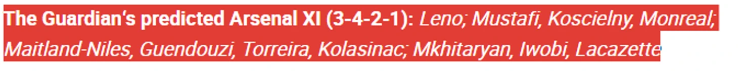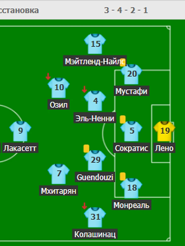 Сегодня схема игры остантся, но английские издания отмечают что мы увидим куда более быстрые фланги, во первых все уверены что выйдет Ивоби на фланг, а вот дальше гадают, или Озил или Мхитарян останутся на фланге. Никто не видит Обамеянга на поле, хотя это очень реально, и вполне допускаю трешку - Ляказетт - Обамеянг - Ивоби на поле.
