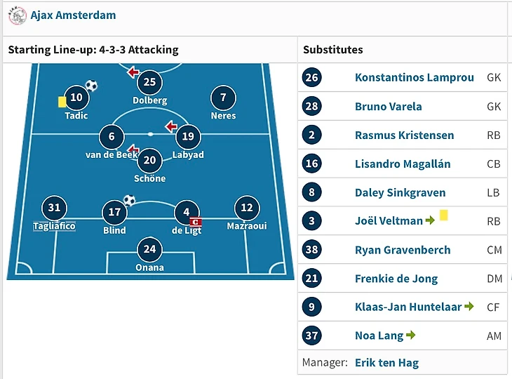 Перенесемся в Оверэйссел. Против «Зволле» Яапа Стама тен Хаг выпустил более атакующий вариант полузащиты: над единственным опорником Шёне расположились два атакующих хавбека – Лабьяд и ван де Бек. На 69-й минуте тех Хаг снял марокканца и выпустил Йоэла Велтмана. Голландец занял привычное место справа в обороне, а Мазрауи заменил своего соотечественника в полузащите. Пропустив гол на 79-й минуте, тен Хагу пришлось искать нестандартное решение, чтобы спасти матч. За семь минут до конца основного времени вместо опорника Шёне вышел 19-летний атакующий универсал Ноа Ланг. Его кросс на 85-й минуте привел к голу Дейли Блинда. «Аякс» победил.