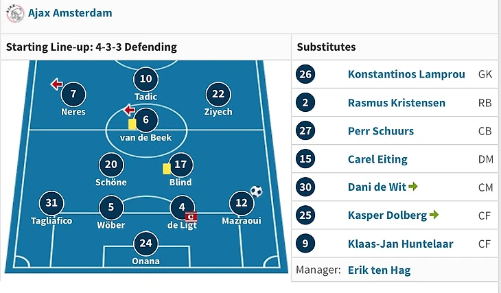 Андре Онана, Костантинос Лампру, Бруну Варела, Расмус Кристенсен, Йоэл Велтман, Маттейс де Лихгт, Дэйли Синкгравен, Нуссаир Мазрауи, Дэйли Блинд, Николас Тальяфико, Донни ван де Бек, Душан Тадич, Закария Лабьяд, Лассе Шёне, Френки де Йонг, Хаким Зиеш, Дани де Вит, Давид Нерес, Клас-Ян Хунтелар, Каспер Дольберг, Юрген Эккеленкамп.