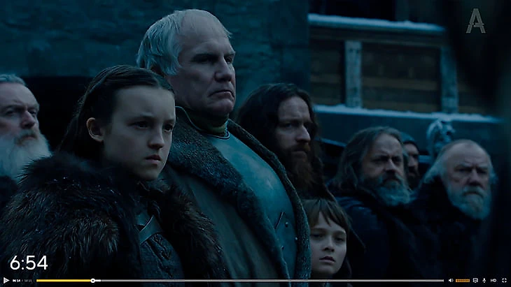 6:54 – Игра престолов. Жители Винтерфелла напряженно всматриваются в Джона и Дейенерис.