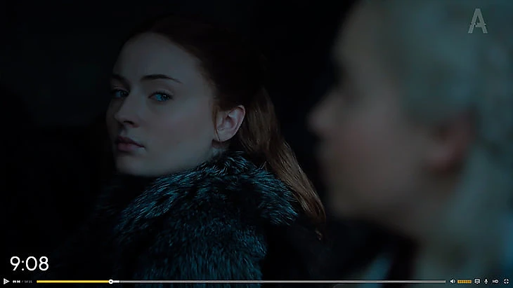 9:08 – Игра престолов. Санса напряженно всматривается в Джона и Дейенерис.