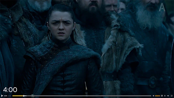 4:00 – Игра престолов. Арья напряженно всматривается в Джона и Дейенерис.