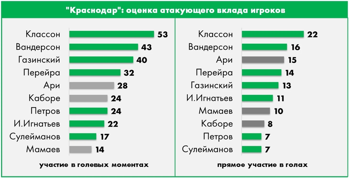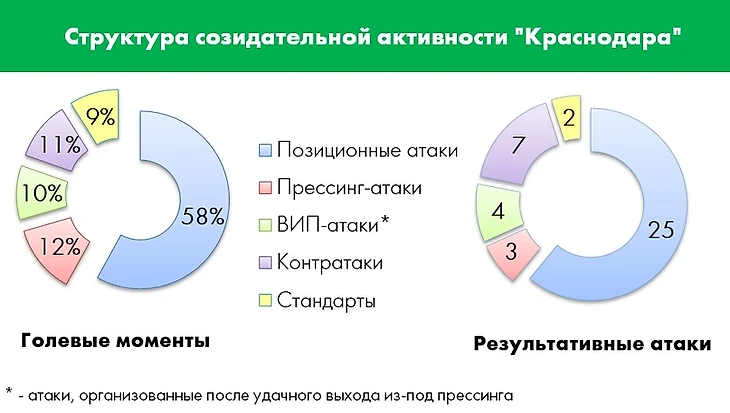 1. «Краснодар» традиционно силен своими изобретательными статичными розыгрышами. В позиционном нападении команда Мусаева создавала голевые моменты во всех матчах без исключения (2,83 в среднем за игру – с отрывом лучший показатель в лиге), забивала – в 17 из 23 поединков.