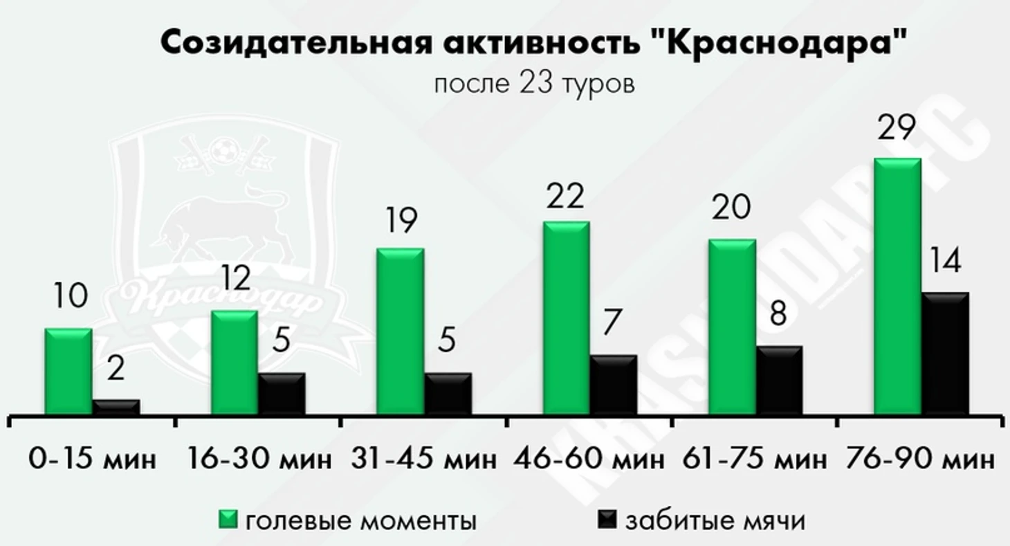 В стартовые 15 минут у «быков» отрицательный креативный и голевой баланс, к перерыву они выходят в символический плюс, а дальше идет мощный форсаж с пиковым финишным отрезком. После 75-й минуты «горожане» забили 14 мячей, причем сразу 8 оказали прямое влияние на результат.