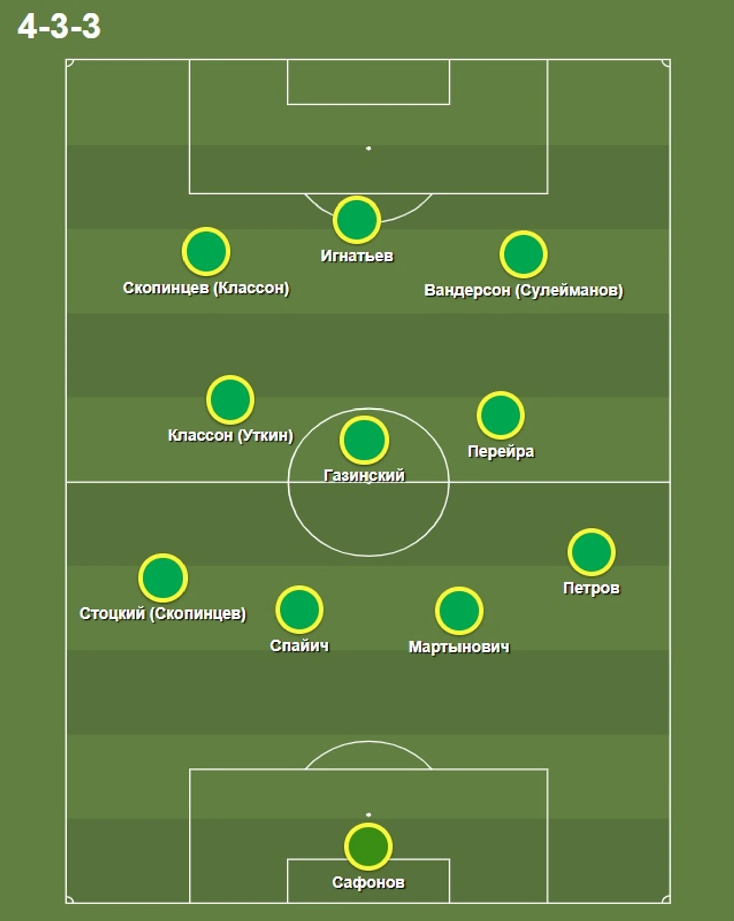 Сафонов - Петров, Мартынович, Спайич, Скопинцев - Газинский, Перейра, Уткин - Вандерсон, Игнатьев, Классон.