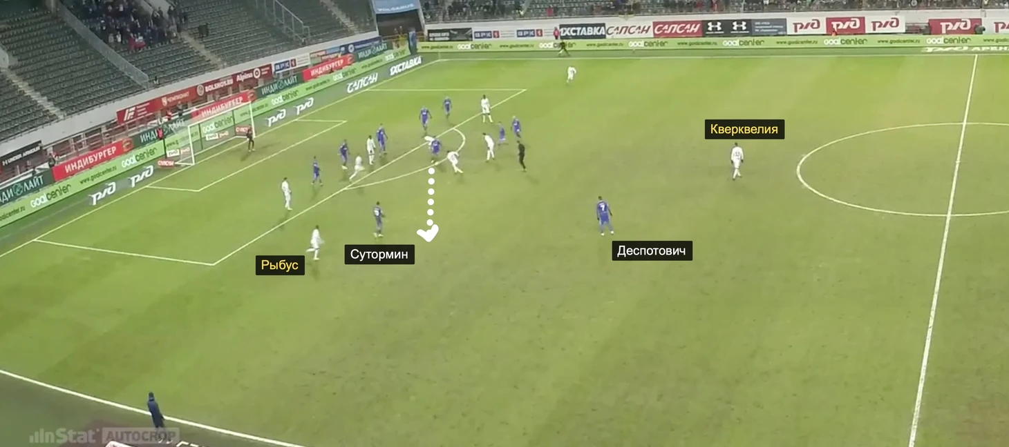 Очень недооцененное решение Федотова – перевод Ойеволе с позиции левого центрального защитника ближе к правому флангу по ходу первого тайма матча с «Крыльями Советов» (второй тур, перевод случился из-за травмы правого центрального защитника Андреева и выхода Сивакова). До того как Ойеволе перешел на правый край, Сутормин навешивал с границы финальной трети поля, находясь близко к боковой линии.