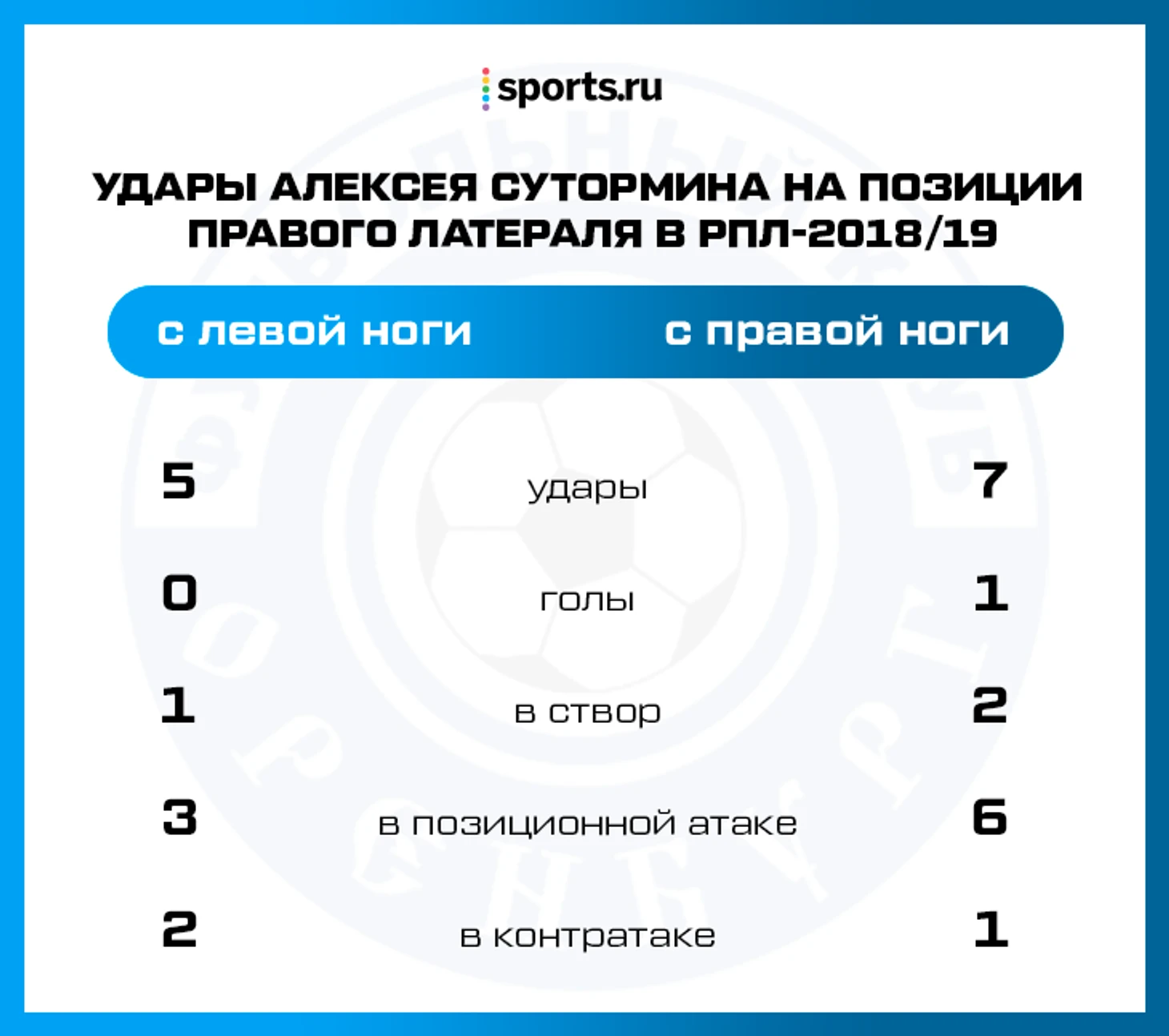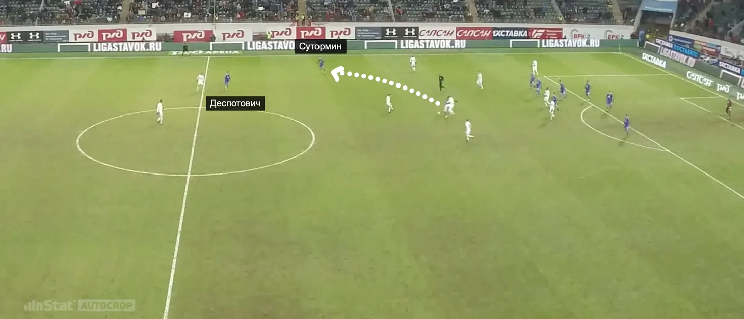 В целом такая активность подходила Сутормину: он и сам активно лез в центр и не боялся бить и подавать левой ногой. При этом Алексей очень качественно убирает мяч под себя: ложный замах похож на настоящий, поэтому соперники оказываются отыгранными (например, Сутормин пробил с левой после ложного замаха в первом матче с «Локо», но удар заблокировал Чорлука).