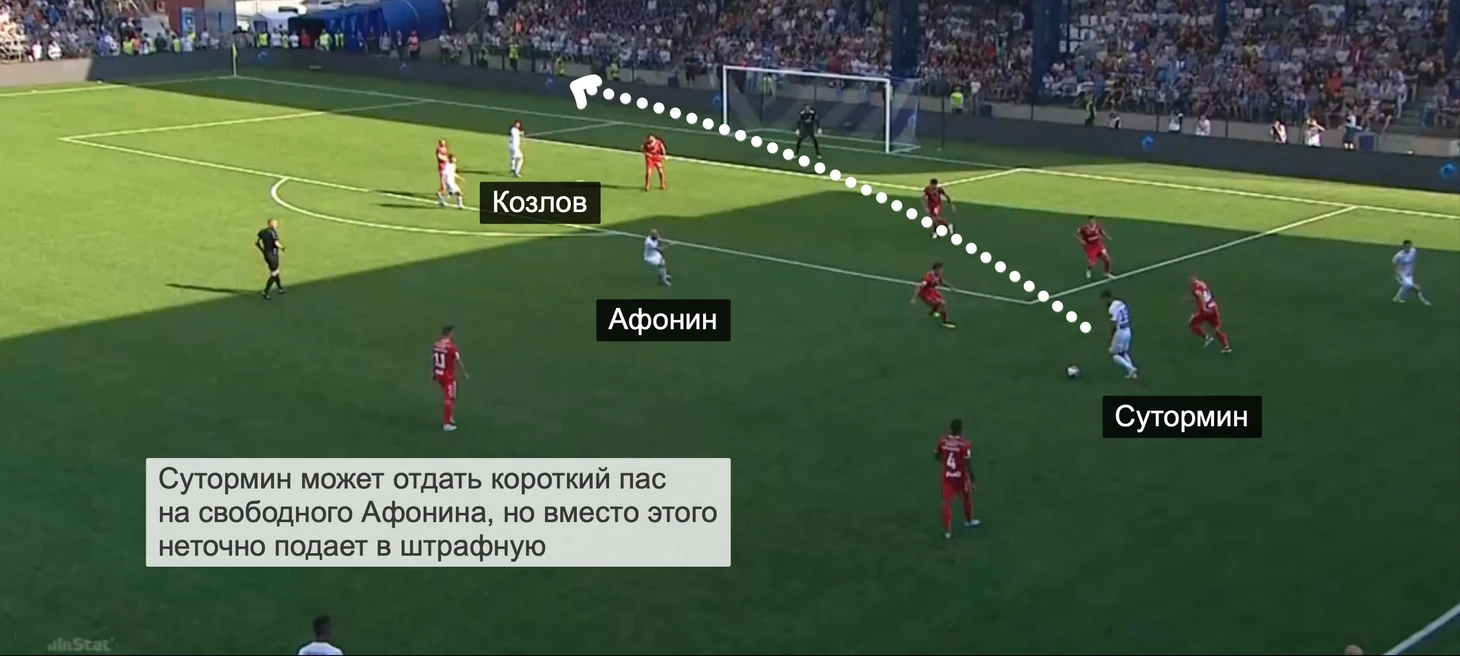 11 из 19 передач в штрафную в период на фланге обороны – навесы, а 6 Сутормин вырезал с левой ноги после смещений в полуфланг. Алексей играл разнообразно, но несколько решений все равно получились неоднозначными.