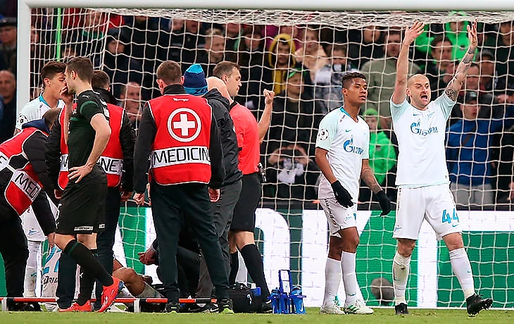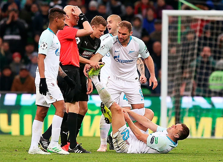 Оздоев на газоне после сильного удара по ногам от Перейры.