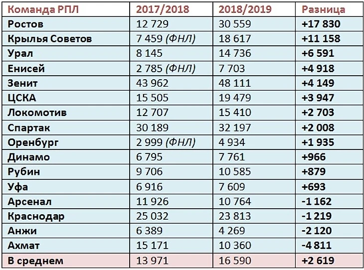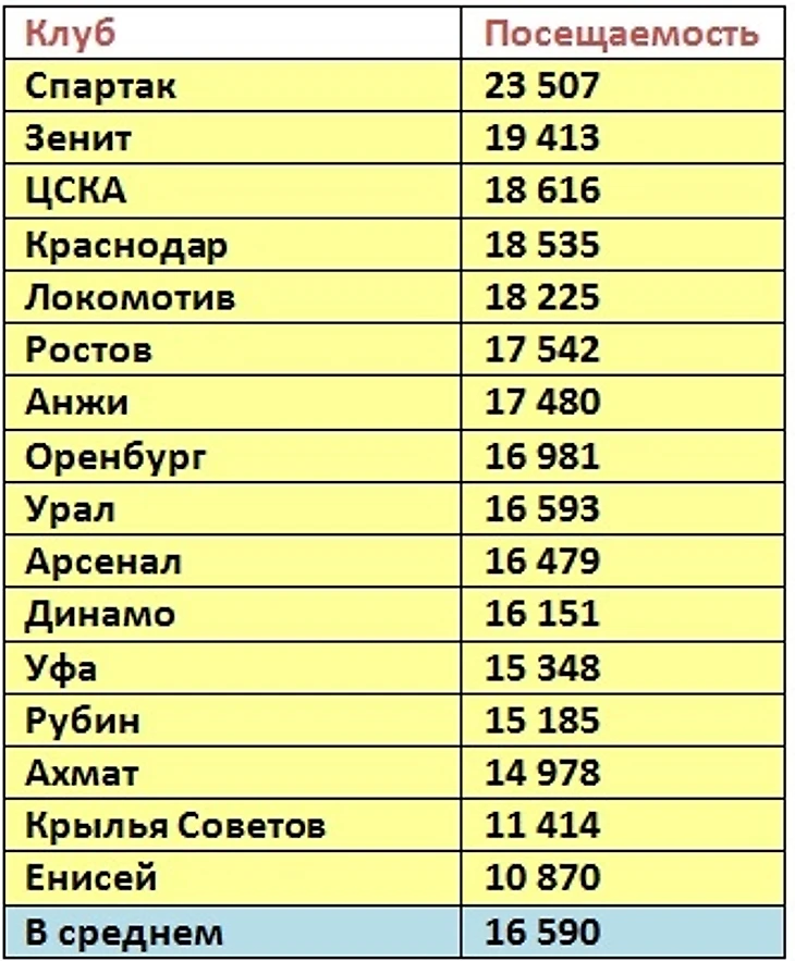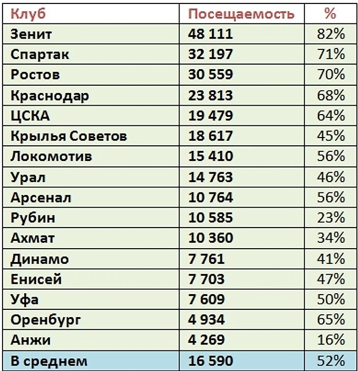 Средняя домашняя посещаемость клубов РПЛ, после 24 тура:
