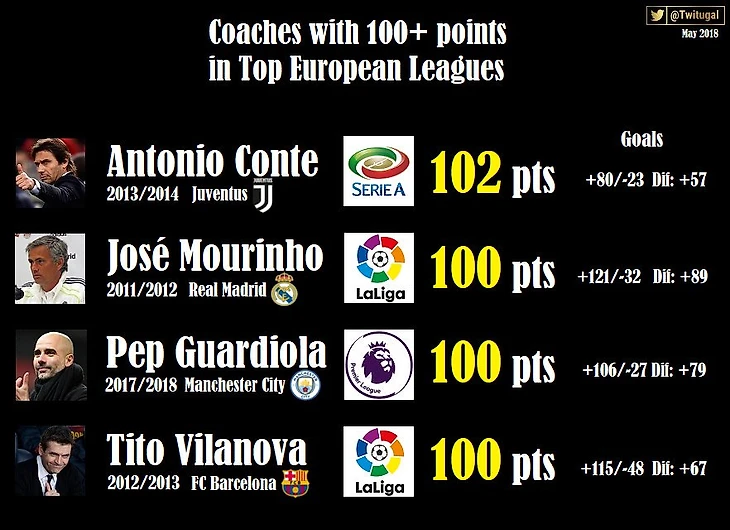 В топ лигах всего 4-м тренерам покорилась заветная отметка в 100+ очков.Первым это сделал Жозе Моуриньо, во втором сезоне в мадридском "Реале", тогда он и выиграл Ла Лигу. Затем этот же рекород повторил ныне покойный экс-тренер "Барсы" Тито Виланова, так же одержав победу в лиге.