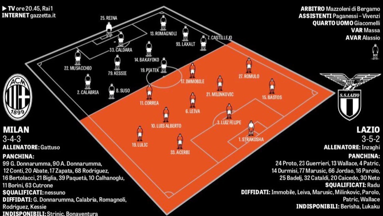 Составы команд на матч Кубка Италии «Милан» - «Лацио» по мнению La Gazzetta dello Sport