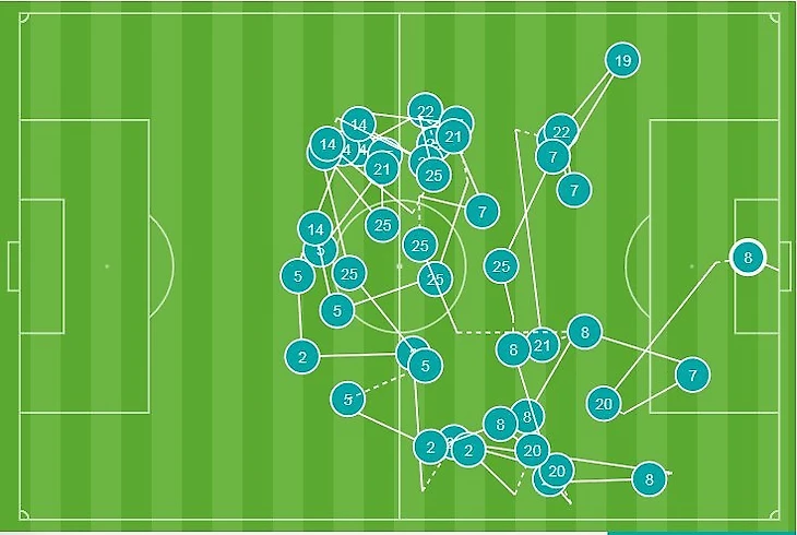 Конечно же, это самая продолжительная голевая комбинация сезона. Последний раз подобное случалось в АПЛ в 2015-м – гол Хуана Маты «Саутгемптону». И, конечно же, ничего подобного никогда не было в матче двух топ-клубов.