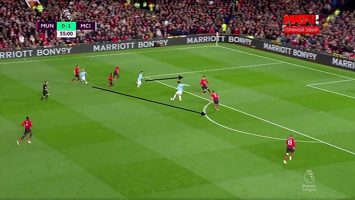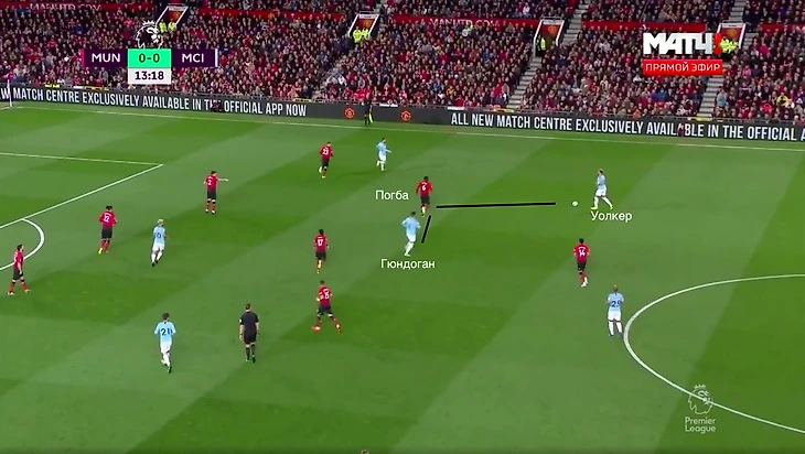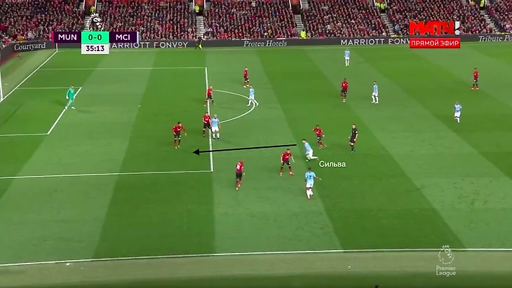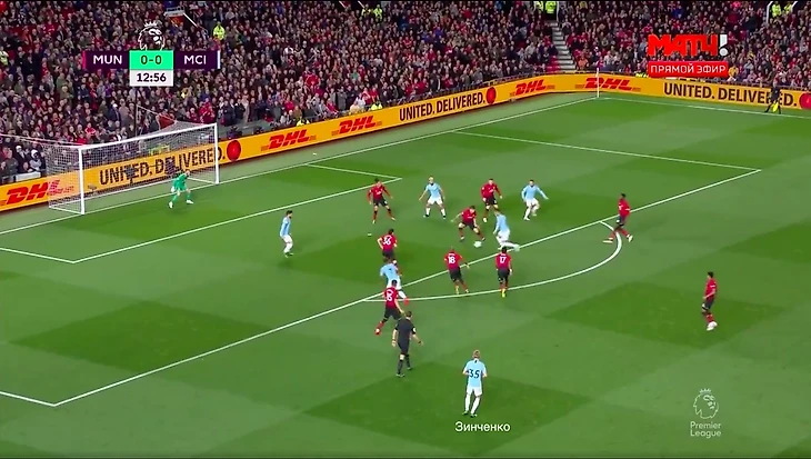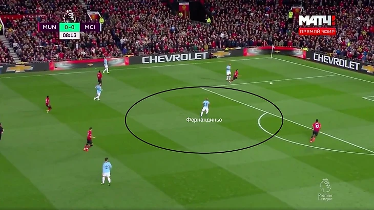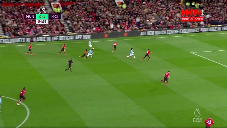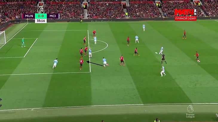 На первых минутах была достаточно равная игра: Юнайтед сдерживал Сити и старался прессинговать гостей уже при розыгрыше от вратаря. Другой вопрос, что без поддержки Янга и Шоу этот прессинг легко разбивался Эдерсоном или Лапортом. Часто у Сити оставался один из полузащитников или дальний крайний защитник.