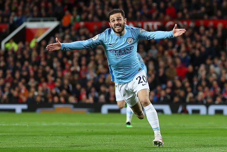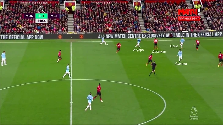 Прессинг Сити был завязан на тройке Стерлинг-Агуэро-Б.Сильва. Они прессинговали защитников Юнайтед, высокое расположение фулбеков хозяев вынуждало отказаться от розыгрыша мяча и играть на вынос.