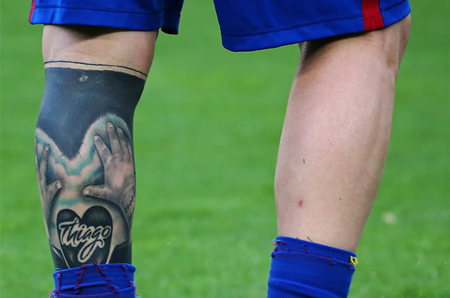 Второе тату Лео тоже посвятил любимому человеку. В ноябре 2012-го у него родился сын Тьяго, а уже в январе Месси и Лопес работали над эскизом тату в честь ребенка. Сначала на левой ноге (ей Лео забил большинство голов) появилось имя Тьяго и детские ручки, а к ноябрю татуировку добили крыльями ангела и сердцем.