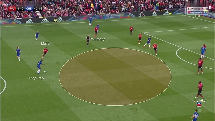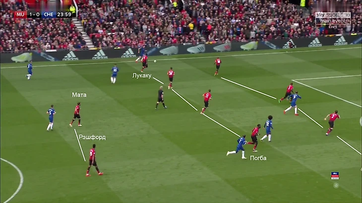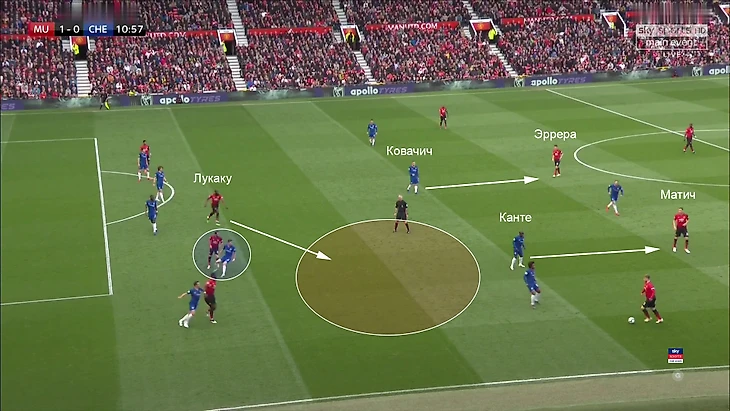 Частично это проявилось в голе «Юнайтед». Даже после смещения Погба на фланг полузащитники «Челси» загружены прямыми оппонентами, поэтому Канте с опозданием реагирует на движение Лукаку в опорную зону: