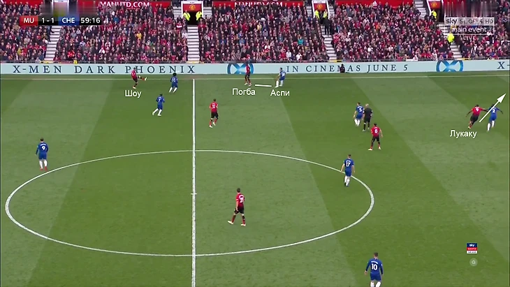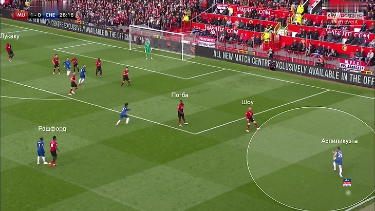 Аналогичная ситуация на другом фланге. В роли Эрреры – Погба. Вместо Алонсо – Аспиликуэта. А открывается снова Лукаку: