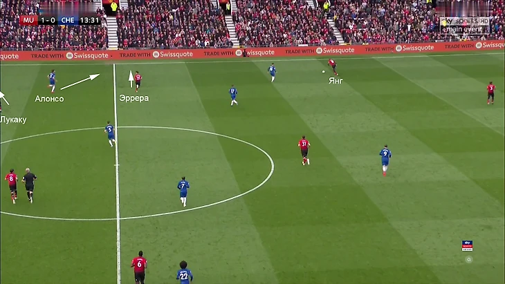 Центральный полузащитник Андер Эррера открывается под Янга на фланге. На это движение реагирует Маркос Алонсо, а в зону Алонсо сразу же откроется Лукаку. Дальний пас – прессинг «Челси» пройден: