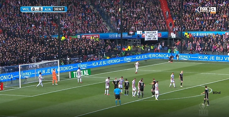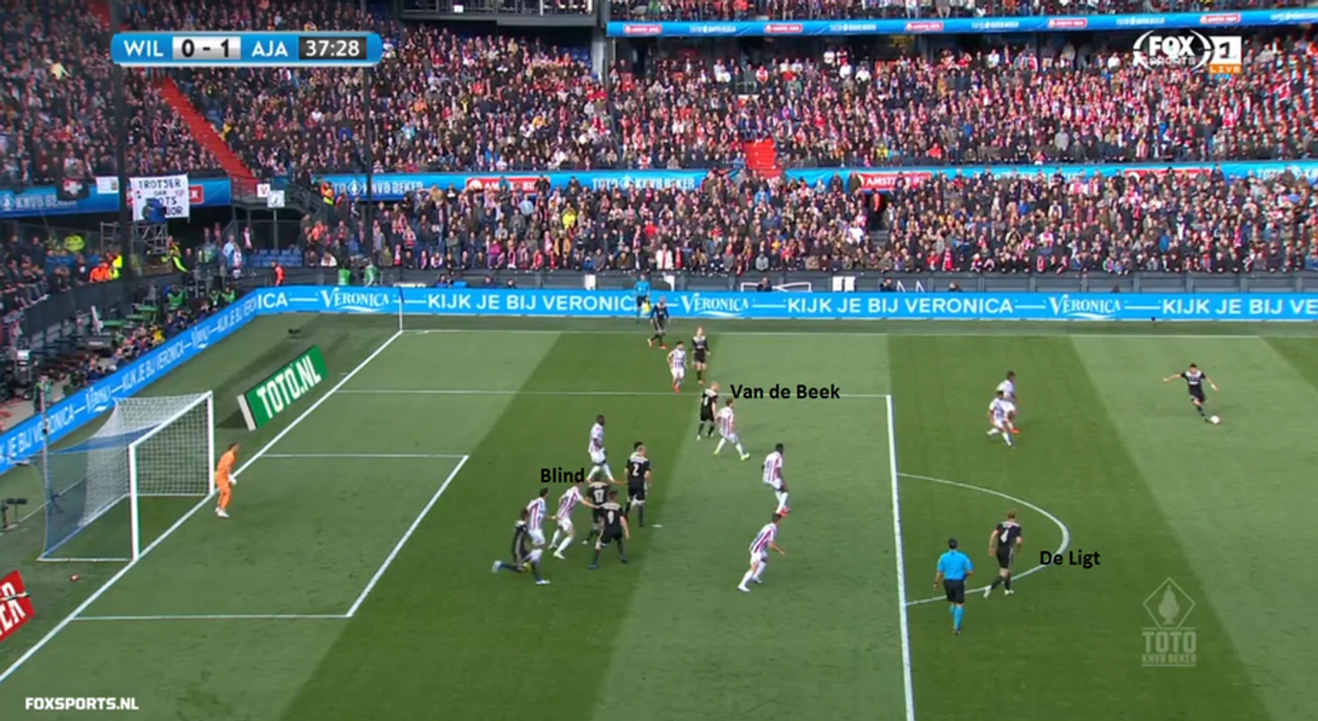 На 38-й минуте «Аякс» разыграл идеальный угловой. Было известно, что «Виллем II» использует персональную опеку после розыгрыша угловых. Зиеш и де Йонг накоротке ввели мяч в игру и адресовали его Тадичу. Тем временем, ван де Бек и де Лихгт рванули в обратном от ворот направлении, увлекая за собой опекунов. А Дейли Блинд, изначально остававшийся на подходе к штрафной площади, ринулся вперед. В результате, истинный таргетмен в этом розыгрыше получил мяч в одиночестве перед вратарем. Легкого кивка головой хватило, чтобы дезориентировать Тимо Велленройтера. 1:0 и план Адри Костера рухнул.