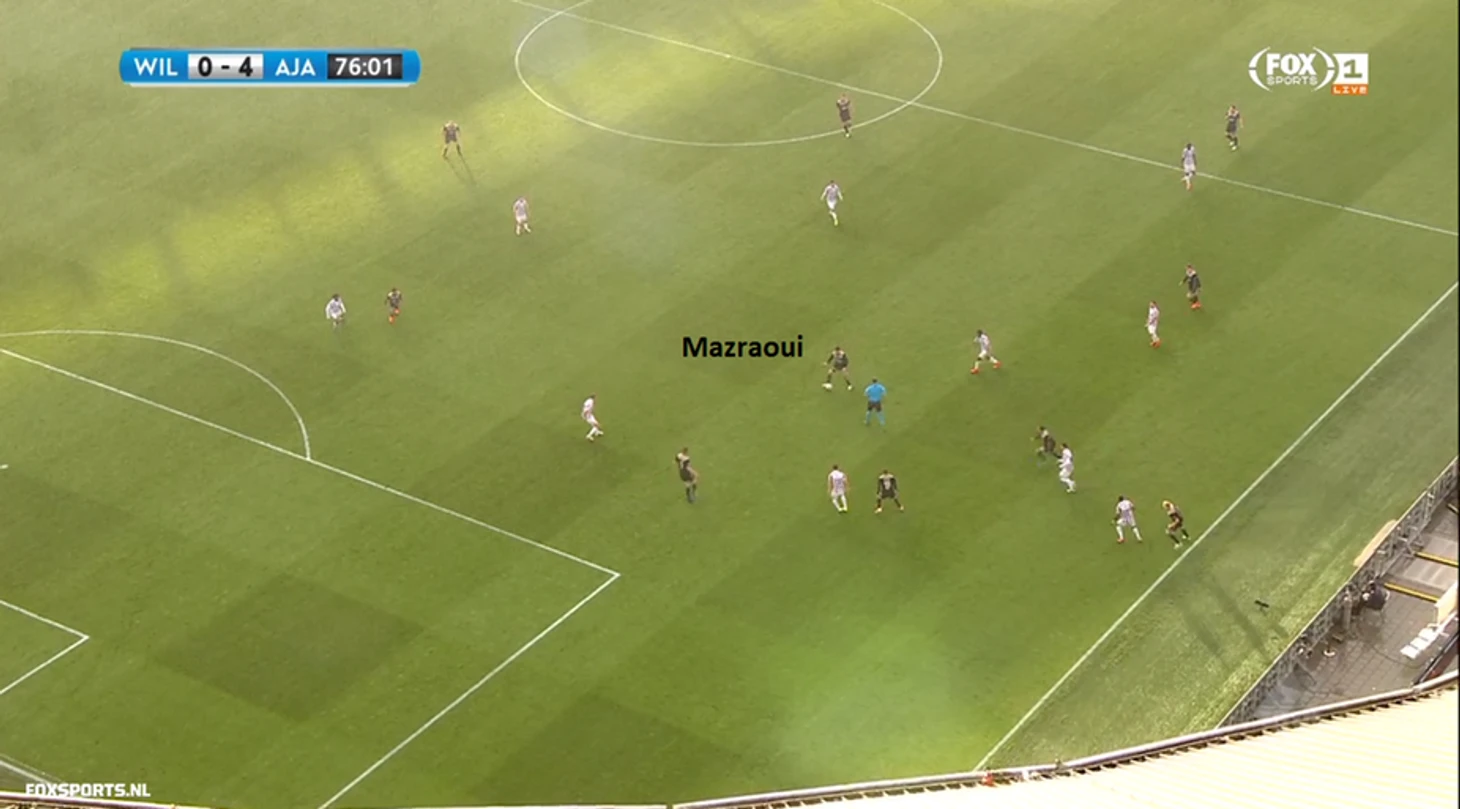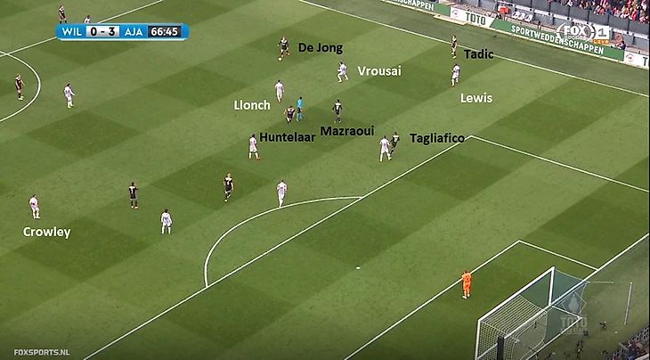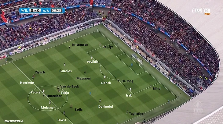 Пример расстановки игроков «Аякса» и «Виллем II». Поль Льонк выдвигается на Френки де Йонга, крайние полузащитники Паласиос и Данкерлуи стягиваются к центру, перекрывая развитие атаки через полузащиту.