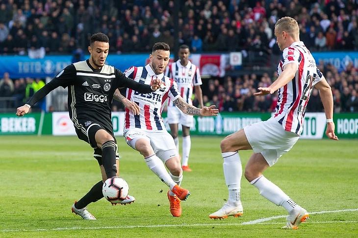«Виллем II» проиграл в этом сезоне «Аяксу» дважды. В первом круге 0:2 в Амстердаме (гости предложили схему 3-5-2) и во втором – 1:4 в Тилбурге (обычные 4-2-3-1). В финале тренер «королевского клуба» Адри Костер справедливо решил отойти от своей привычной схемы и сделал ставку на создание максимально неудобного положения для соперника. То есть сковать Френки де Йонга в начальных стадиях атаки, закрыть продвижение мяча через центр и не оставлять слишком много пространства за линией мяча.