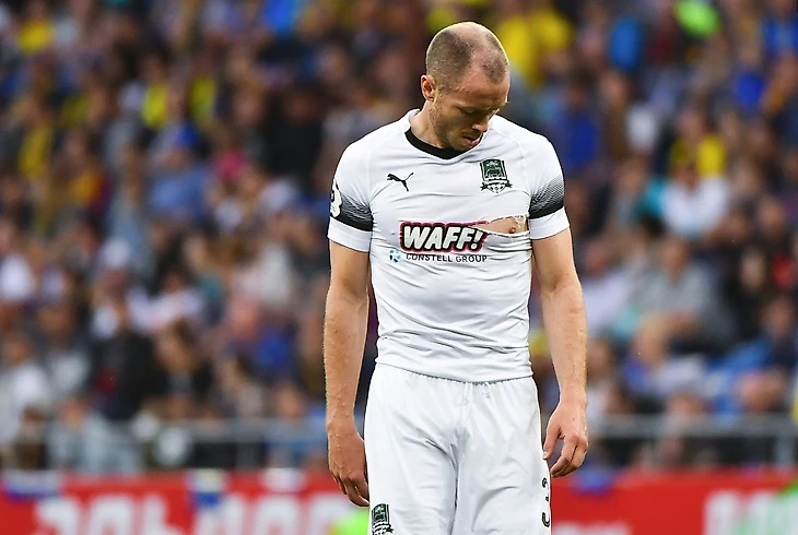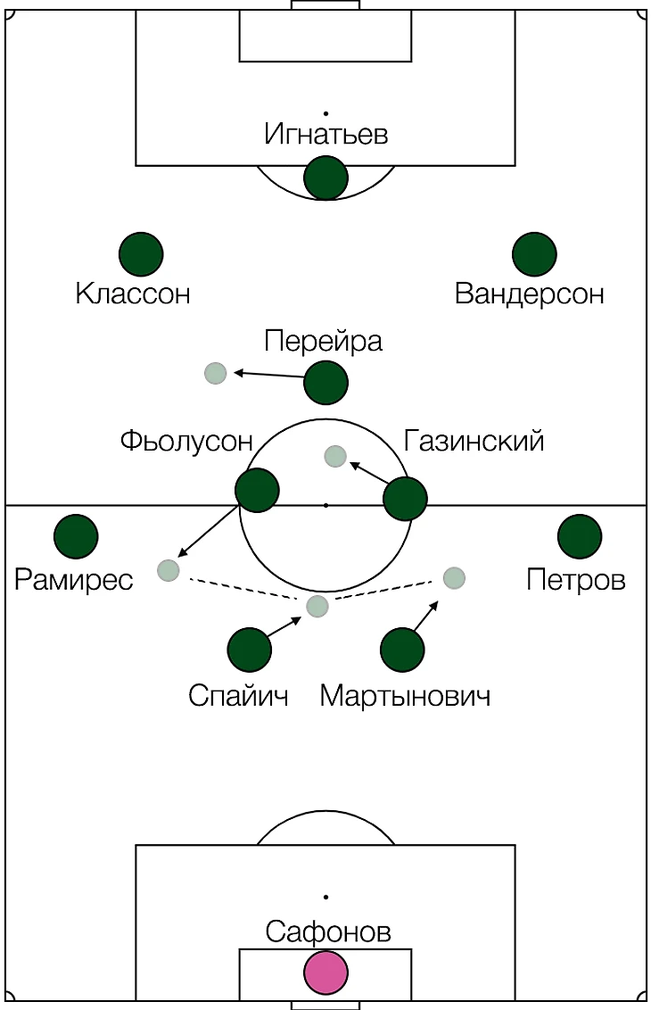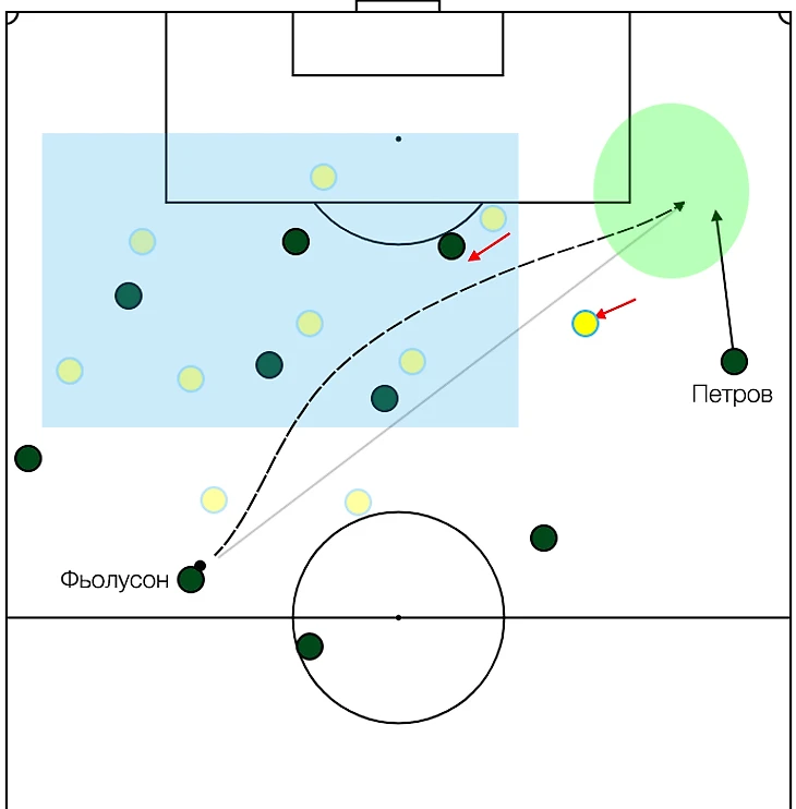 Краснодар сдвигает обороняющихся ближе к левого флангу. Фьолусон отдаёт пас на изолированного Петрова.