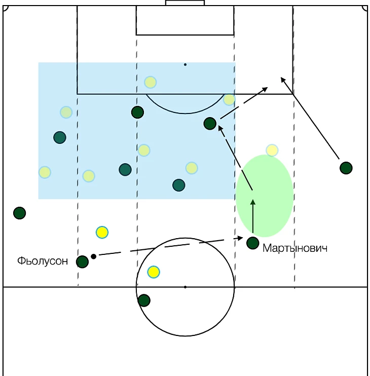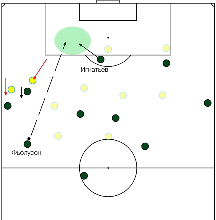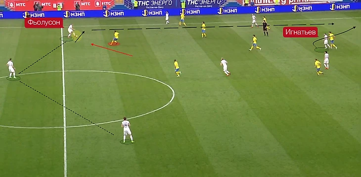Попов выдвигается в прессинг. Фьолусон одним касанием подрабатывает себе мяч, убирая оппонента. Вторым - отдаёт пас под рывок Игнатьева