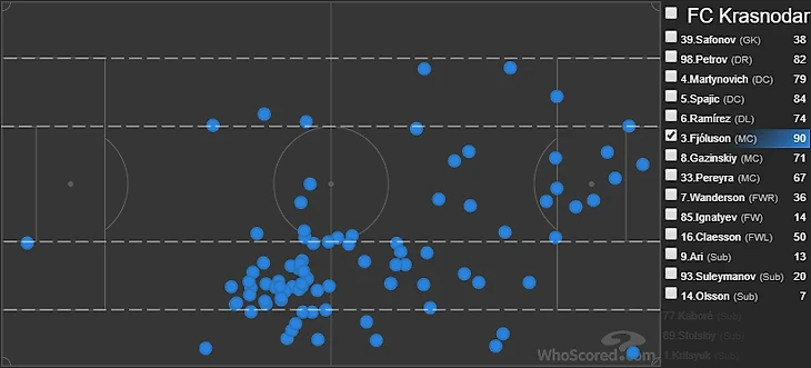 А в этом видео мы отмечали отличные пасовые способности Фьолусона. Команда с доминирующем стилем должна пользоваться таким ресурсом и находить ему применения. Мусаев соединил две эти идеи и сделал исландца "ложным" опорником. Когда Краснодар был с мячом Фьолусон акцентировано занимал позицию в левом полуфланге первой линии и начинал атаки , без мяча - играл в опорной зоне, создавая численное преимущество против 2-х нападающих Ростова и потенциальных контратак.