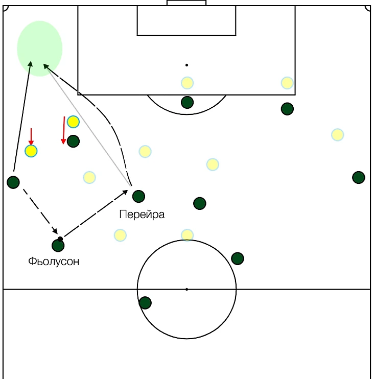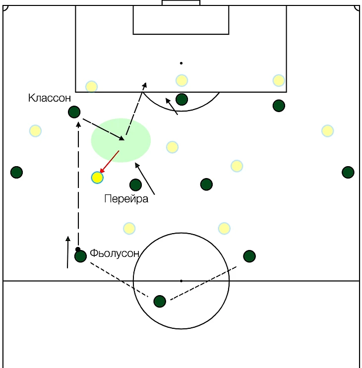 Йон отдаёт пас на Классона, тот в одно касание на Перейру в освободившуюся зону.