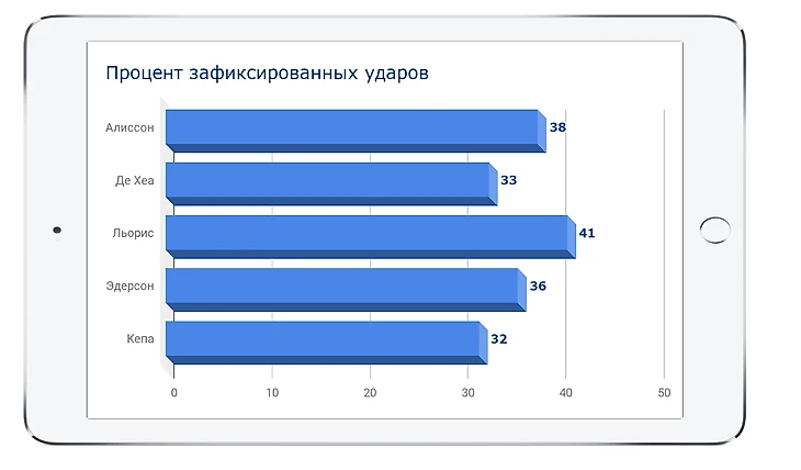 Среди всех сэйвов голкипера нужно уделять особое внимание пойманным намертво мячам. Каждый раз, когда вратарь отражает удар, существует риск отскока на ногу соперника и добиванию, или подбора, способного перерасти в новую атаку противника. По проценту зафиксированных мячей от общего числа ударов в нашем "шорт-листе" лидирует Уго Льорис с 41%, Алиссон второй, но и остальные голкиперы нашего шорт-листа примерно на одном достаточно высоком уровне.