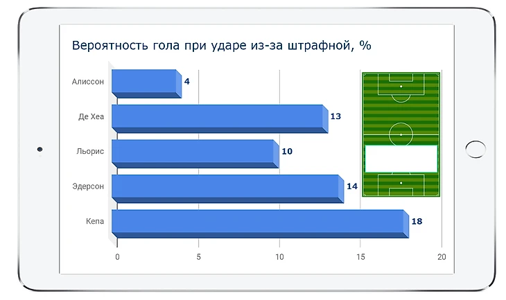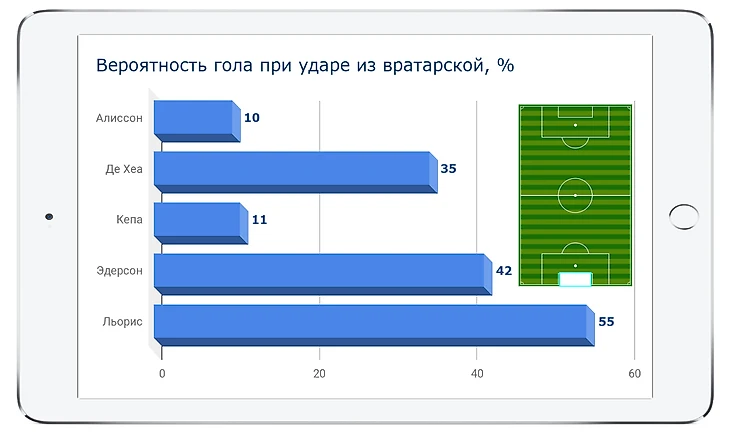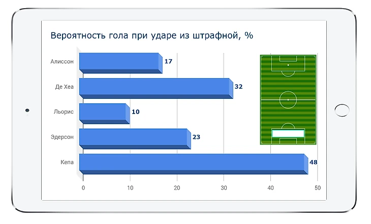Дальше рассмотрим насколько сложно поражать ворота, защищаемые данными голкиперами, ударами из разных игровых зон. Вероятность гола ударами из-за пределов штрафной измеряется процентом пропущенных мячей вратарём к общему числу ударов из данной зоны. В диаграмме представлено числовое отражение ожидаемого гола при дальнем ударе и конкретном голкипере в воротах соперника. Лидеры всё те же, легче всего с ударами из-за пределов штрафной справляется Алиссон, хуже всех - Кепа.